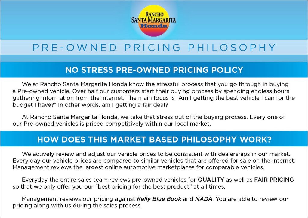 The drive to Honda Rancho Santa Margarita, CA, is a scenic journey that winds through the heart of Orange County, blending suburban charm with natural beauty. As you make your way south along the I-5 or east from the coast, the urban landscape gradually gives way to rolling hills, open spaces, and picturesque neighborhoods. Towering palm trees line the roads, and the backdrop of the Santa Ana Mountains becomes more prominent the closer you get. Whether youâre arriving from the bustling city or the coastal towns, the approach to our dealership in beautiful Rancho Santa Margarita feels like a peaceful retreat and to top it off with every vehicle purchase, we will be sending you off with a FULL TANK GAS, courtesy of your local Honda helpful dealer. Be sure to ask about the following products we offer: Wheel Black-out Powder Coating, Wheel and Tire Packages, Black Out Packages, Leather Packages, Window Tint, Extended Warranties, Service Contracts, Vinyl Wraps, Ding and Dent Protection, Wheel and Tire Protection.